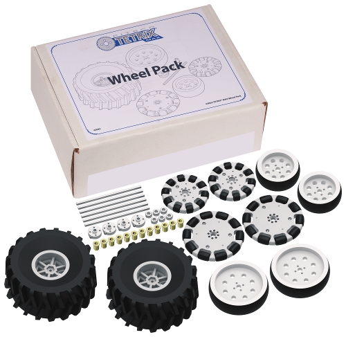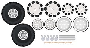 Состав: • 2 всенаправленных-колеса (3 дюйма) • 2 всенаправленных колеса (4 дюйма) • 2 колеса (3 дюйма) • 2 колеса (4 дюйма) • 6 осей из нержавеющей стали (100 мм) • 12 бронзовых втулок (11 мм) • 6 алюминиевых проставок оси • 4 алюминиевые ступицы оси • 2 вездеходные шины |